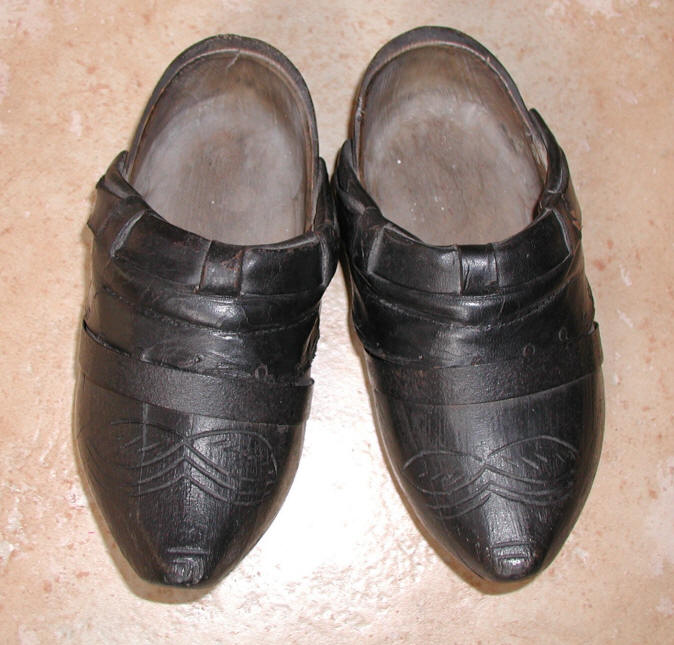 Autrefois, on marchait beaucoup pour se déplacer. On utilisait des sabots en bois et en cuir dans lesquels il fallait mettre d'épaisses chaussettes (sur la photo, les sabots d'enfant de ma grand-mère à 8 ans).